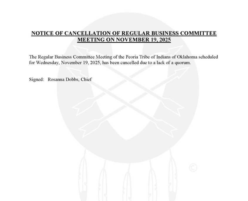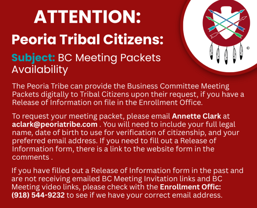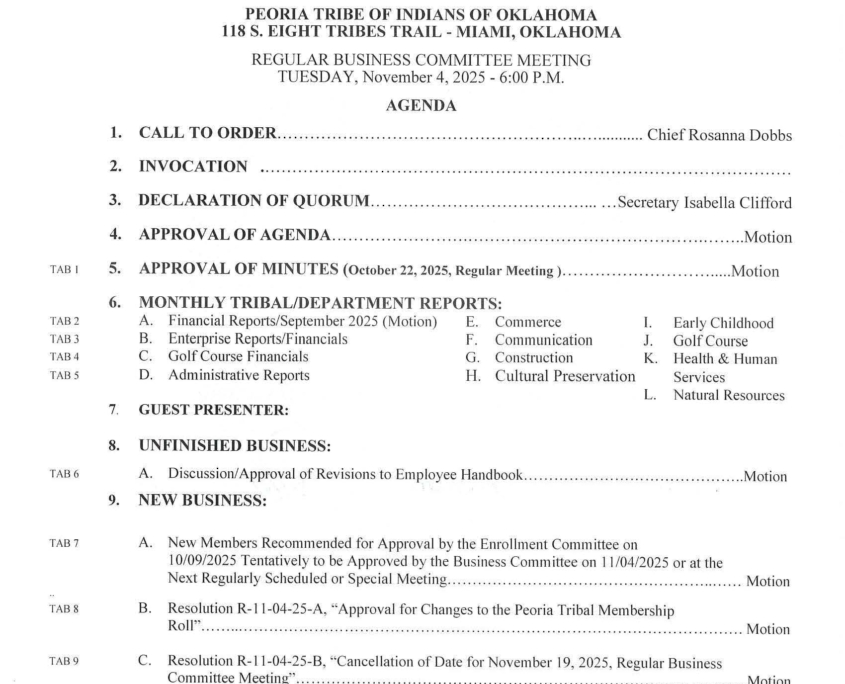 All Business Committee Meetings are held at the Peoria Tribe Community Center on the first Tuesday and third Wednesday of each month at 6pm. Tribal members are welcome!