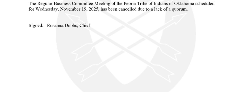 https://peoriatribe.com/wp-content/uploads/Cancellation-for-Reg-Mtg-Notice-ltrhead.jpg22001700Annette Clarkhttps://peoriatribe.com/wp-content/uploads/logo-text-copyright.pngAnnette Clark2025-11-05 09:12:412025-11-05 09:12:41NOTICE OF CANCELLATION OF NOVEMBER 19, 2025 REGULAR BC MEETING