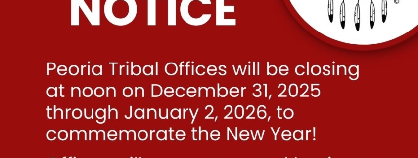 Offices Closing for New Year Holiday December 30, 2025/in News /by Annette Clark https://peoriatribe.com/wp-content/uploads/New-Years-Closure-1.jpg 788 940 Annette Clark https://peoriatribe.com/wp-content/uploads/logo-text-copyright.png Annette Clark2025-12-30 09:49:042025-12-30 10:04:21Offices Closing for New Year Holiday