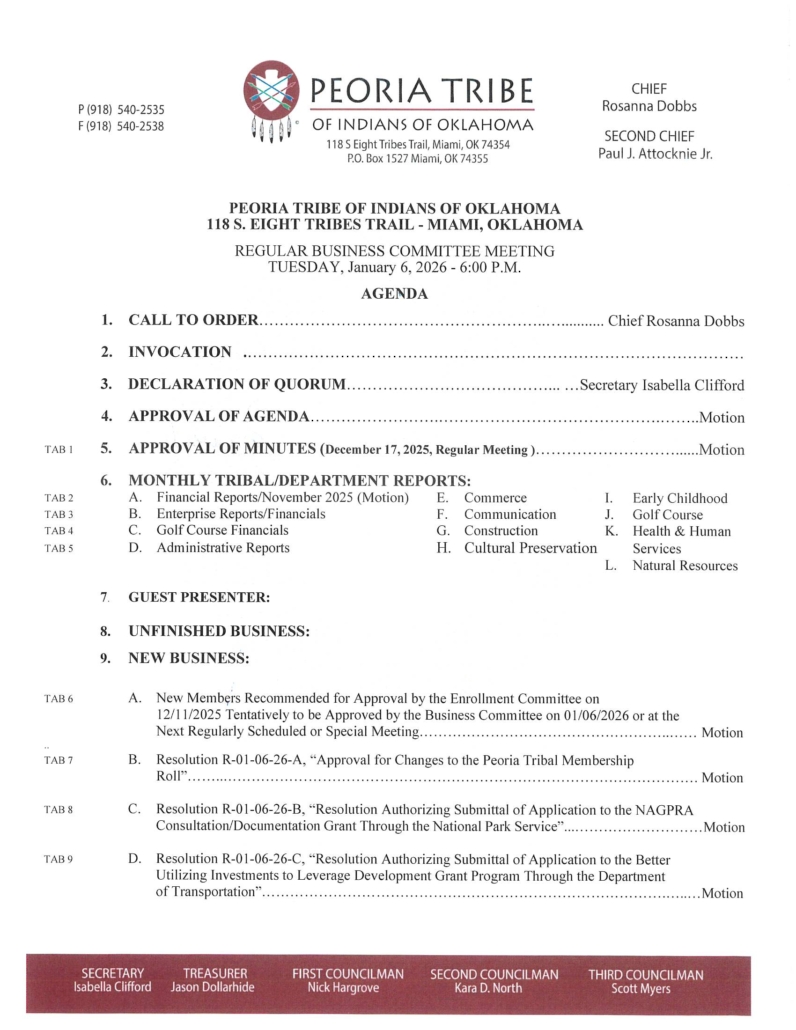 January 6, 2026 BC Meeting Agenda January 5, 2026/in Business Committee, News, Notices /by Annette Clark https://peoriatribe.com/wp-content/uploads/Signed-01-06-26-Agenda_Page_1.jpg 2200 1700 Annette Clark https://peoriatribe.com/wp-content/uploads/logo-text-copyright.png Annette Clark2026-01-05 08:49:022026-01-05 08:49:02January 6, 2026 BC Meeting Agenda