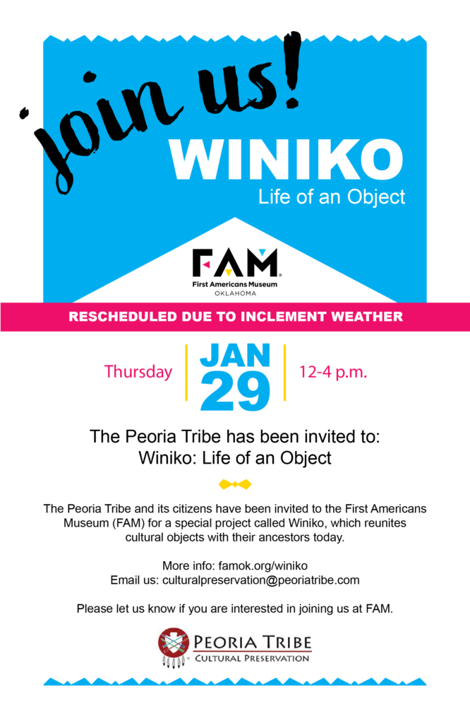https://peoriatribe.com/wp-content/uploads/Peoria-Tribe-Half-Sheet-Flyer-and-Fb-Graphic_Page_1-1.jpg25501650Annette Clarkhttps://peoriatribe.com/wp-content/uploads/logo-text-copyright.pngAnnette Clark2026-01-16 11:54:262026-01-22 09:32:44Date Change…Winiko: Life of an Object at the FAM!